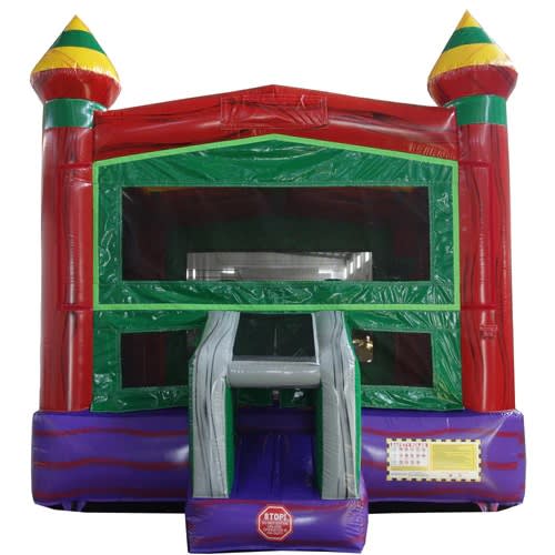 Modular Design Bounce House is super cool. This red, green, and purple inflatable is one of our most popular choices for birthday parties. This Bounce House is great for birthday parties, events, recreation centers and more. This theme is a popular seller, and is appealing to both boys and girls of all ages. All of our inflatables were designed with children's safety at heart, featuring an inflated landing zone, safe enough for kids of all ages.