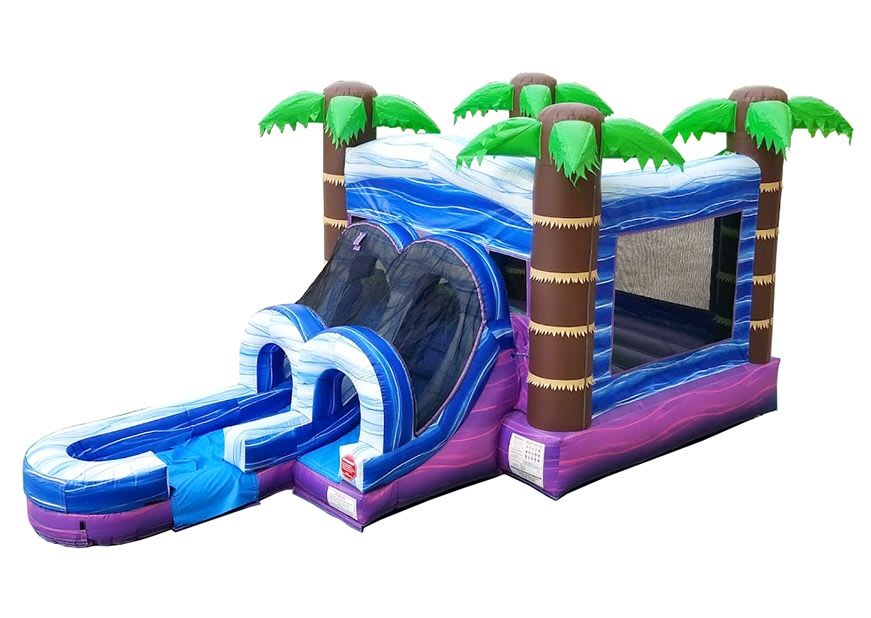 Every child loves bounce houses! A bouncy house is an absolute blast and provides entertainment that few other activities can provide. Hosting a birthday party or special event for some small children? Have an outdoor event in the hot Summer months? There's no better way to cool off, have a blast and make a splash than with the Kids Tropical Water Slide Combo. Kids can step inside the spacious bouncing area and jump to their heart's delight, then climb up the interior rock wall and head down the toddler-sized water slide to the pool at the bottom to cool off from the summertime heat! It's a 2-for-1 deal packed into a single unit that simply spells F-U-N. All of our inflatable wet slides were designed with children's safety at heart, featuring an inflated landing zone with built-in drains that keeps the water level low enough for a good time, but safe enough for kids of all ages.