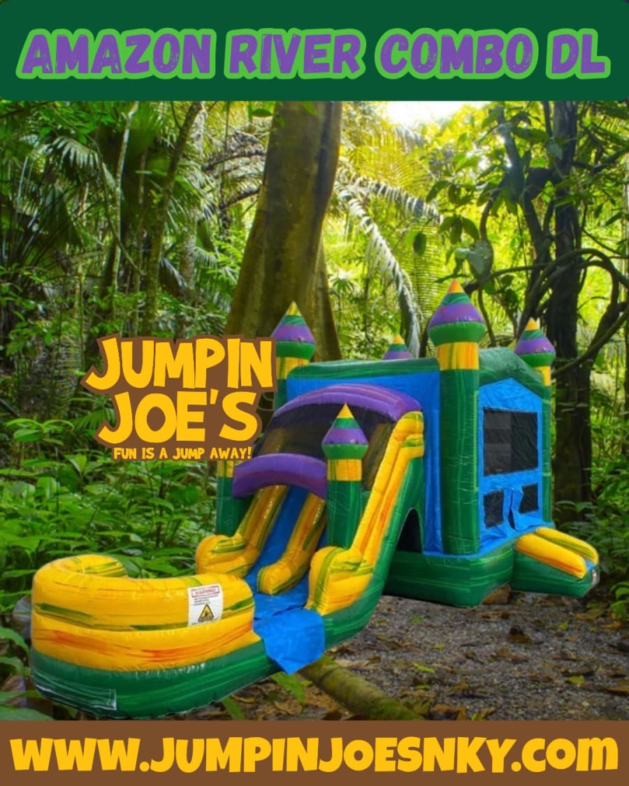 The Amazon River Dual Lane Combo is a River of fun! Its dual lane slide, bounce house, climbing wall, and basketball hoop means it can easily keep kids entertained! This combo unit features an entrance safety step. This allows your kids to safely and easily enter and exit the inflatable. The netting is clear and easy to see through so you have a great view of the kids playing inside. The slides on our combo bounce houses are both wet and dry. Extended landing area for when used dry or a large safety pool when used wet. This will keep your kids safe when coming down the slide. The Amazon River Combo has a green, yellow and blue color scheme.All of our inflatable wet slides were designed with children's safety at heart, featuring an inflated landing zone with built-in drains that keeps the water level low enough for a good time, but safe enough for kids of all ages.