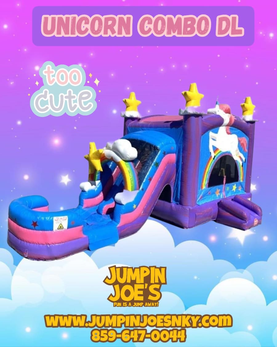 It's simply MAGICAL! Our Unicorn Combo is custom-made with extra details! It features a whimsical 3D unicorn pop out, a fun rainbow arch over the slides, along with stars and vibrant colors! It's sure to bring a Sparkle to your party. This combo unit features an entrance safety step. This allows your kids to safely and easily enter and exit the inflatable. The netting is clear and easy to see through so you have a great view of the kids playing inside. The slides on our combo bounce houses are both wet and dry. Extended landing area for when used dry or a large safety pool when used wet. This will keep your kids safe when coming down the slide. The Unicorn Combo has a blue, purple and pink color scheme. This combo has a large bounce pad with safety netting, basketball hoops to give your riders some entertainment while others are climbing an easy-step ladder to ride this spectacular slide! All of our inflatable wet slides were designed with children's safety at heart, featuring an inflated landing zone with built-in drains that keeps the water level low enough for a good time, but safe enough for kids of all ages.