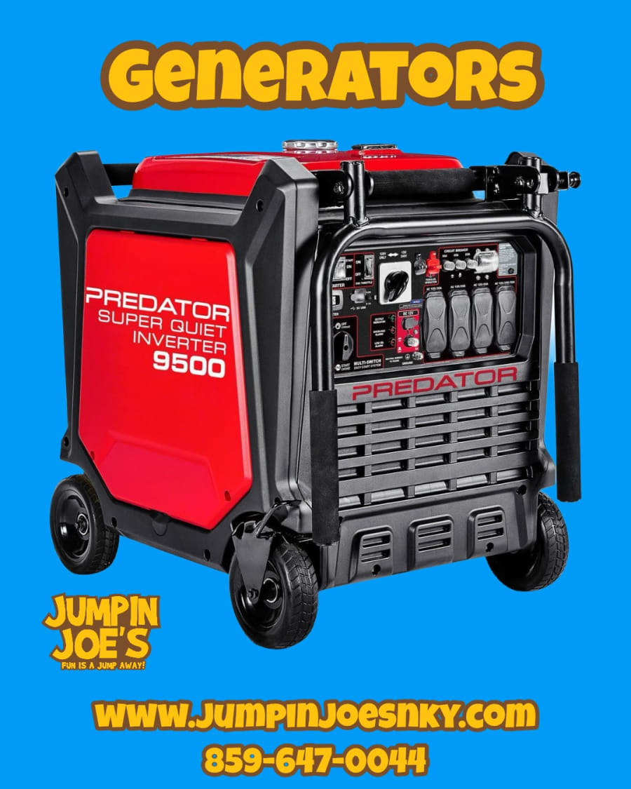 Need power at your event? No problem Jumpin Joe's has all your power needs! 5,000 watt to 15,000 watt generators!