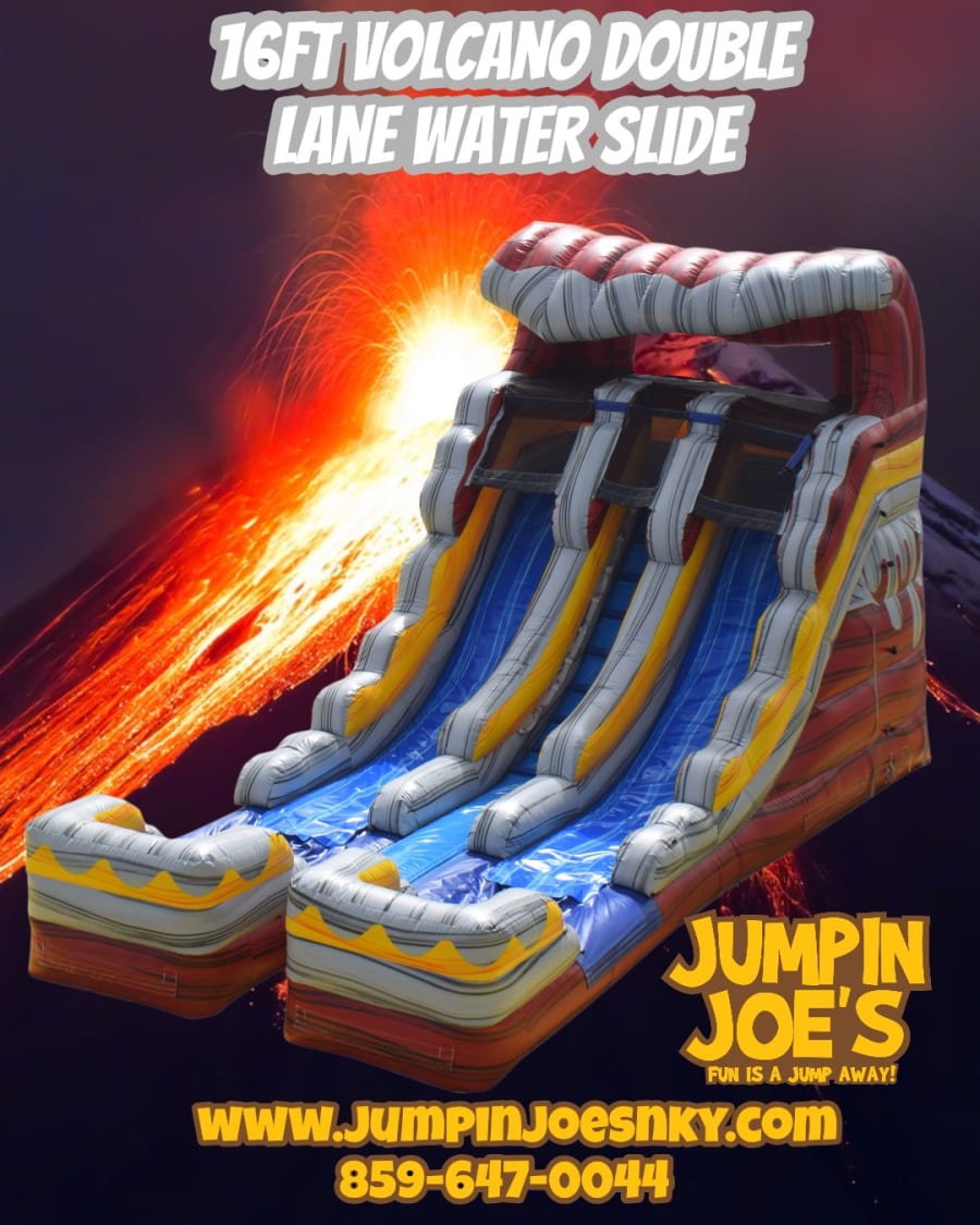 Let your event shine with this amazing 16ft Volcano Double Lane Water Slid attraction! Great for themes or just a fun visual addition this 16' Water Slide, has everything to be the focal point of any backyard party, field day, or outdoor event. With its neutral colors, this versatile inflatable can be used by both girl parties and boy parties events! Try out this inflatable slide on a hot day with water, simply connect a standard garden hose to the built-in misting system and dive into some refreshing relief from the summer heat! All of our inflatable wet slides were designed with children's safety at heart, featuring an inflated landing zone with built-in drains that keeps the water level low enough for a good time, but safe enough for kids of all ages.